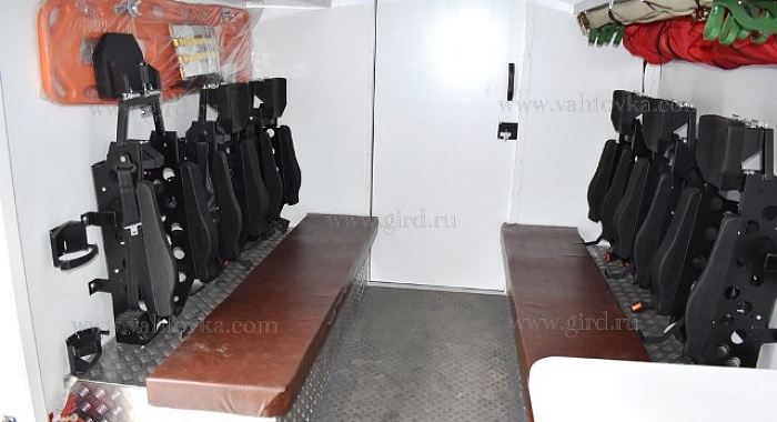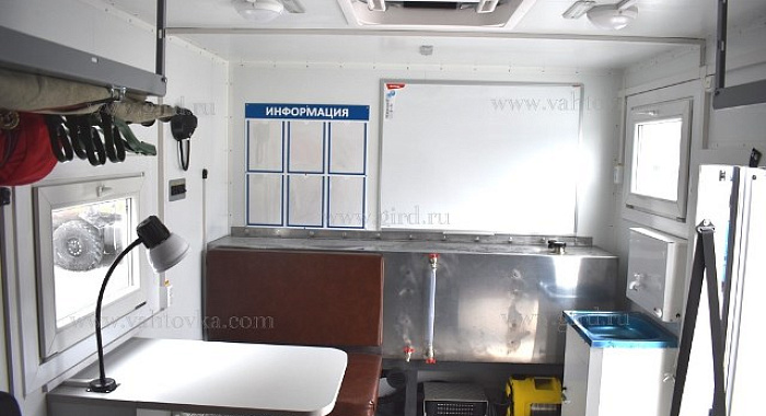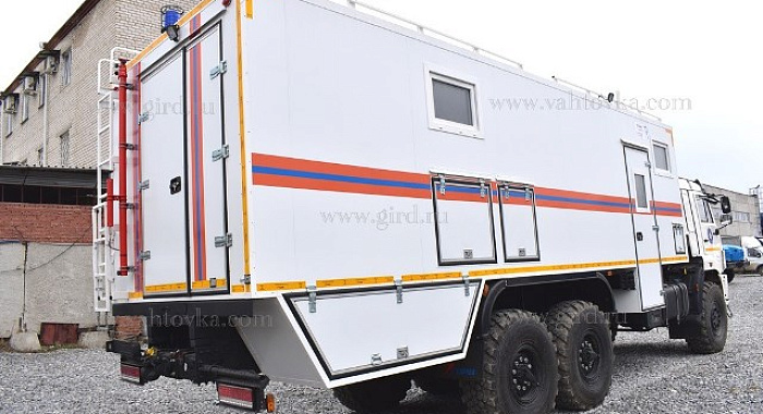 Кузов-фургон толщиной 60мм из сэндвич панелей производства ГИРД габаритные размеры: 7850х2500х2190 закреплен жестко к силовым элементам закрепленным на раме шасси; состоит из двух отсеков; наружная обшивка - плакированный металл; утеплитель - стиропен 50; внутренняя обшивка - плакированный металл; пол – бакелитовая фанера (18 мм), стиропен (S=60 мм), фанера (S=12 мм), покрытие пола в пассажирском отсеке рифленая резина – автолин; покрытие пола в технологическом отсеке - рифленый алюминий с отбортовкой 300мм Обрамление фургона – оцинковка Климатическое исполнение от -40 С до +40 С |