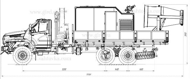 Кроме того, функционал автомобиля разработан таким образом, что при необходимости, с помощью крано-манипуляторной установки РК 21.501 (с максимальным подъемным моментом 20,9 тм), возможно легко демонтировать единый технический блок, и использовать технику как бортовой автомобиль с КМУ.