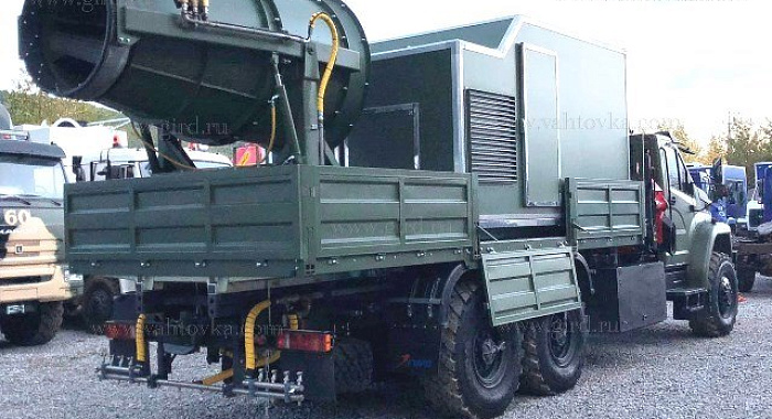 Специальная санитарная машина ССМ на внедорожнике Урал Next с крано-манипуляторной установкой РК 21.501sld предназначена для дезактивации, дегазации и дезинфекции наружных поверхностей техники, зданий (сооружений) и дорог с твердым покрытием мощным газовым и газокапельным потоком. Дезинфекция поверхностей осуществляется прерывистым газокапельным потоком, образующимся при вводе воды и растворов в газовый поток, который распыляется с помощью специальной установки-турбины с углом поворота 360 градусов и дальностью полива до 50 метров.