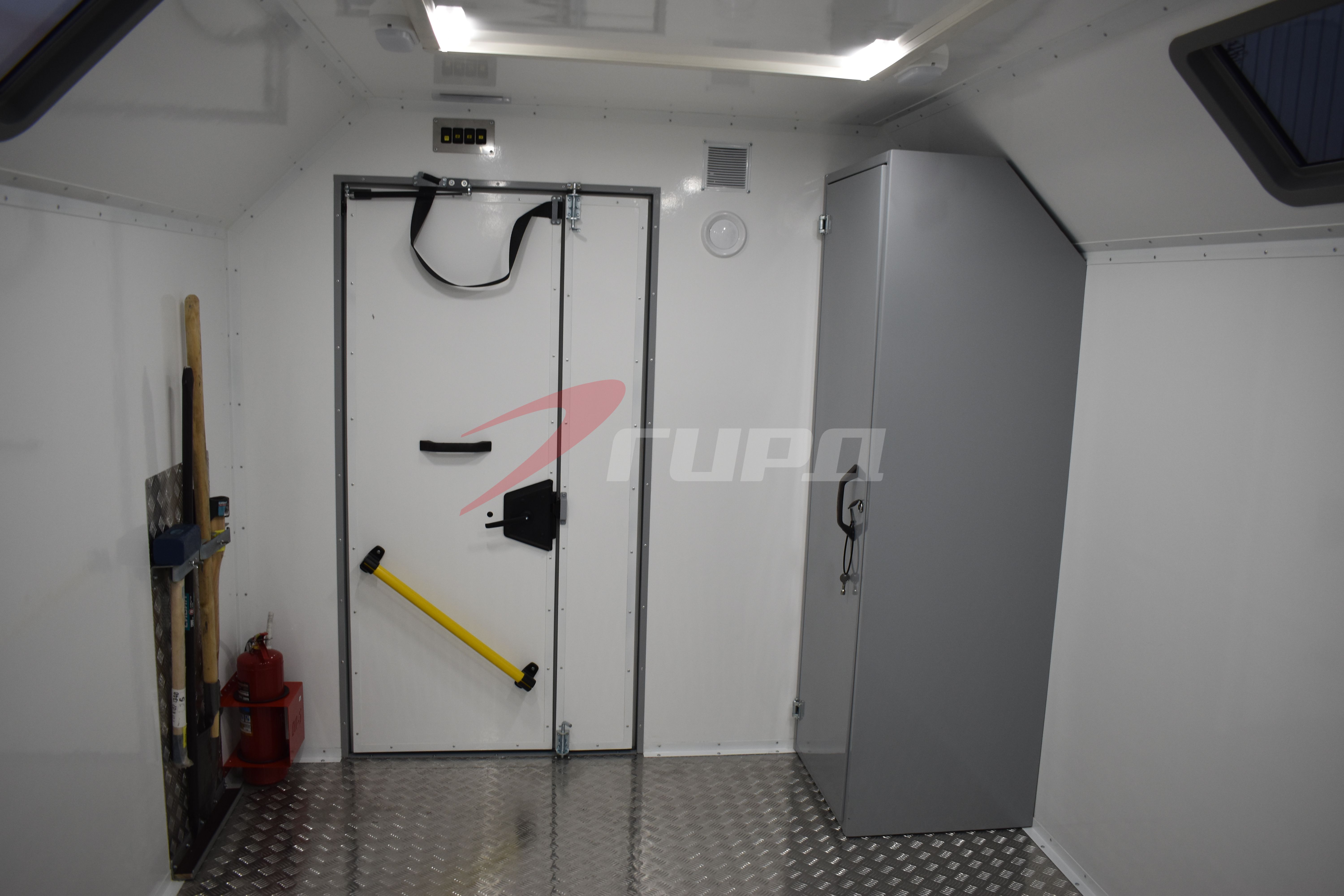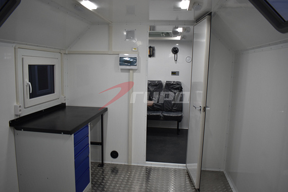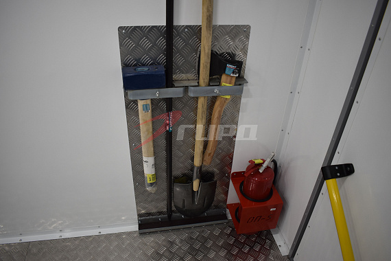 - Большой рабочий отсек оборудован верстаком с ящиками, металлическим шкафом для хранения оборудования и шанцевыми инструментом.