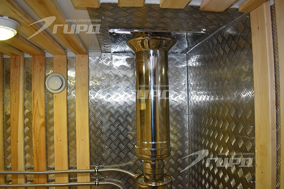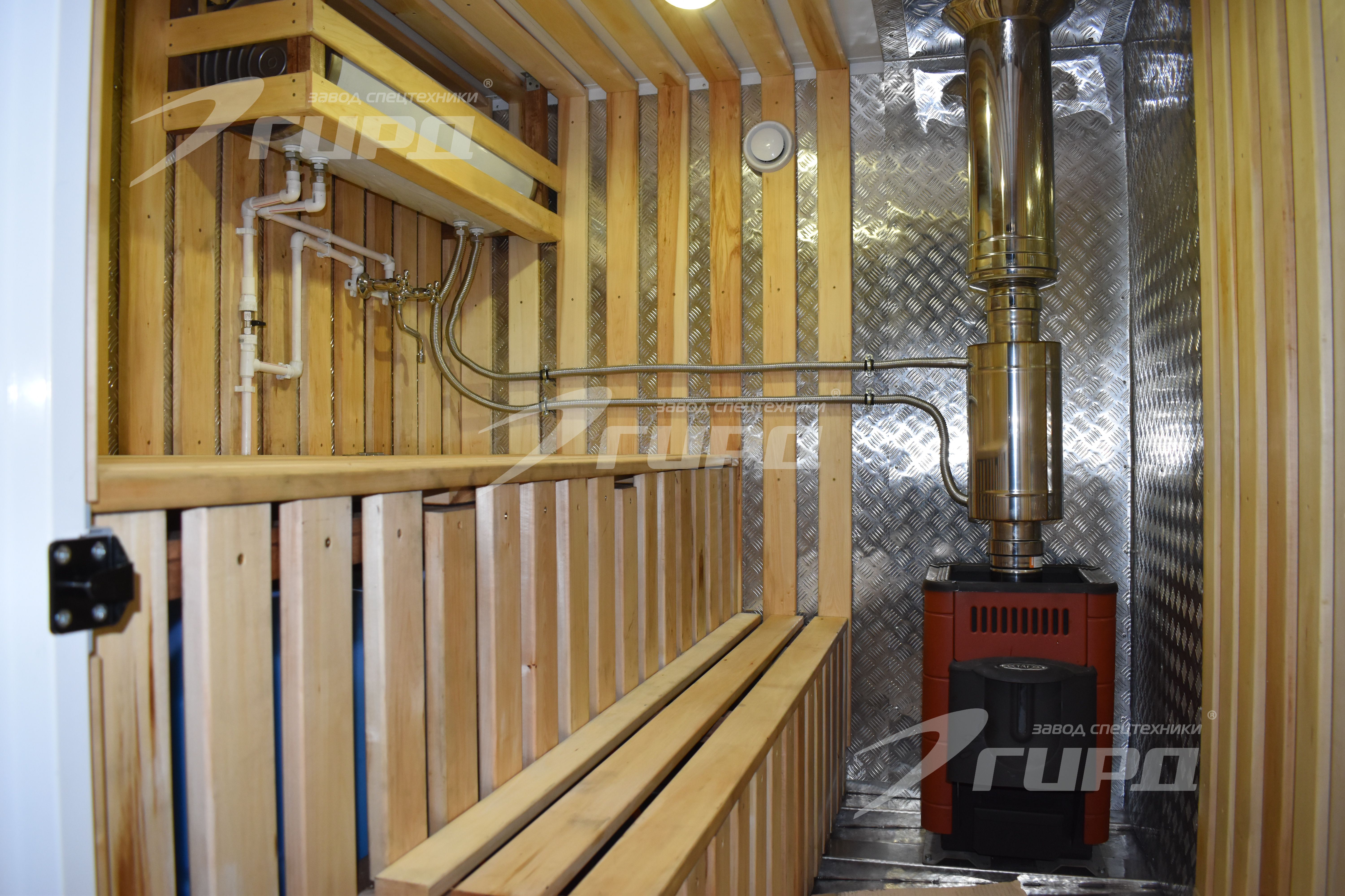Первый автомобиль: имеет жилой и банный отсеки. Бытовой отсек оборудован спальными местами, рабочим столом, шкафами и раковиной. Банный отсек покрыт алюминиевой защитой и брусками из лиственницы, установлена банная печь, алюминиевый поддон со сливом воды, деревянный полог, предусмотрена подача воды.