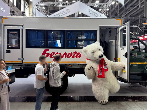 На стенде АЗ «УРАЛ» представлен 20-местный вахтовый автобус БЕРЛОГА на шасси УРАЛ-80 4х4.
