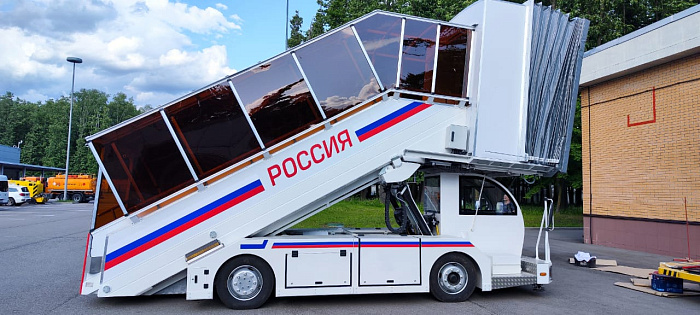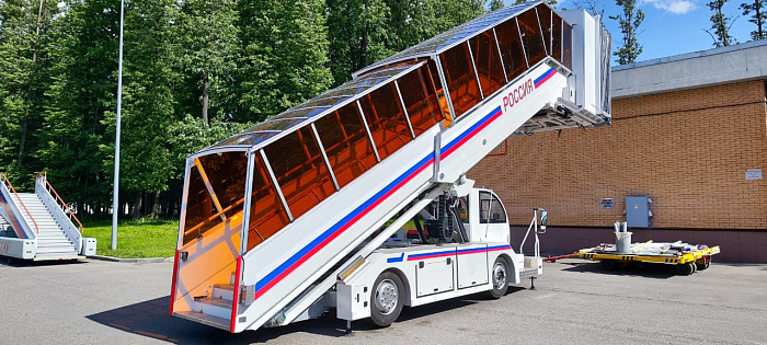 Один из трапов оснащен галереей и капюшоном - это инновационное техническое решение, разработанное заводом спецтехники ГИРД. Такой трап обеспечивает высокий уровень комфорта – защищает пассажиров во время посадки и высадки от осадков и неблагоприятной погоды. Он оснащен специальными механизмами, которые позволяют быстро и легко настраивать высоту и угол наклона галереи под различные типы самолетов.
