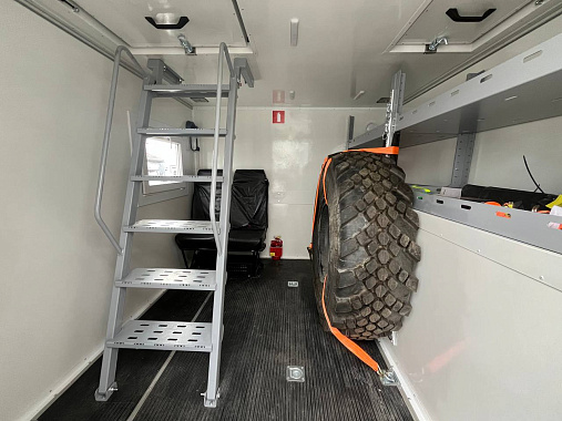 6. Установлена лестница (внутри фургона) для подъёма на дополнительную рабочую с покрытием рифлёным, не допускающим скольжение, с поручнями