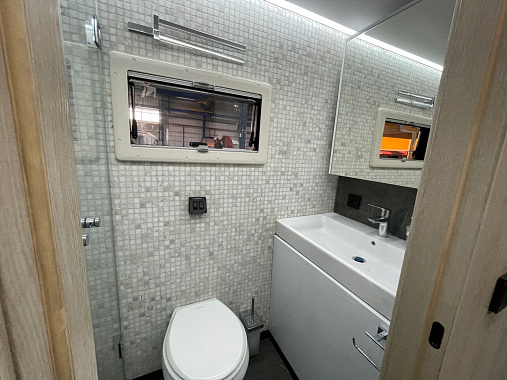 Дизайнерское решение салона отражает дух современных технологий, а сочетание глянцевых и матовых поверхностей подчеркивают статус интерьера. Использование в декоре природных цветовых решений, мягких материалов обивки и приглушенной подсветки создает атмосферу отдыха и спокойствия. Напольное покрытие жилого отсека выполнено из кварц-винила с электрическим подогревом.