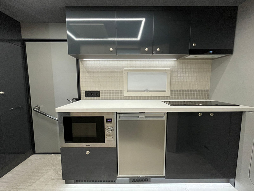 На входе расположен шкаф с полками и оружейным сейфом. В шкаф интегрирован пульт управления и мониторинга системами автодома.