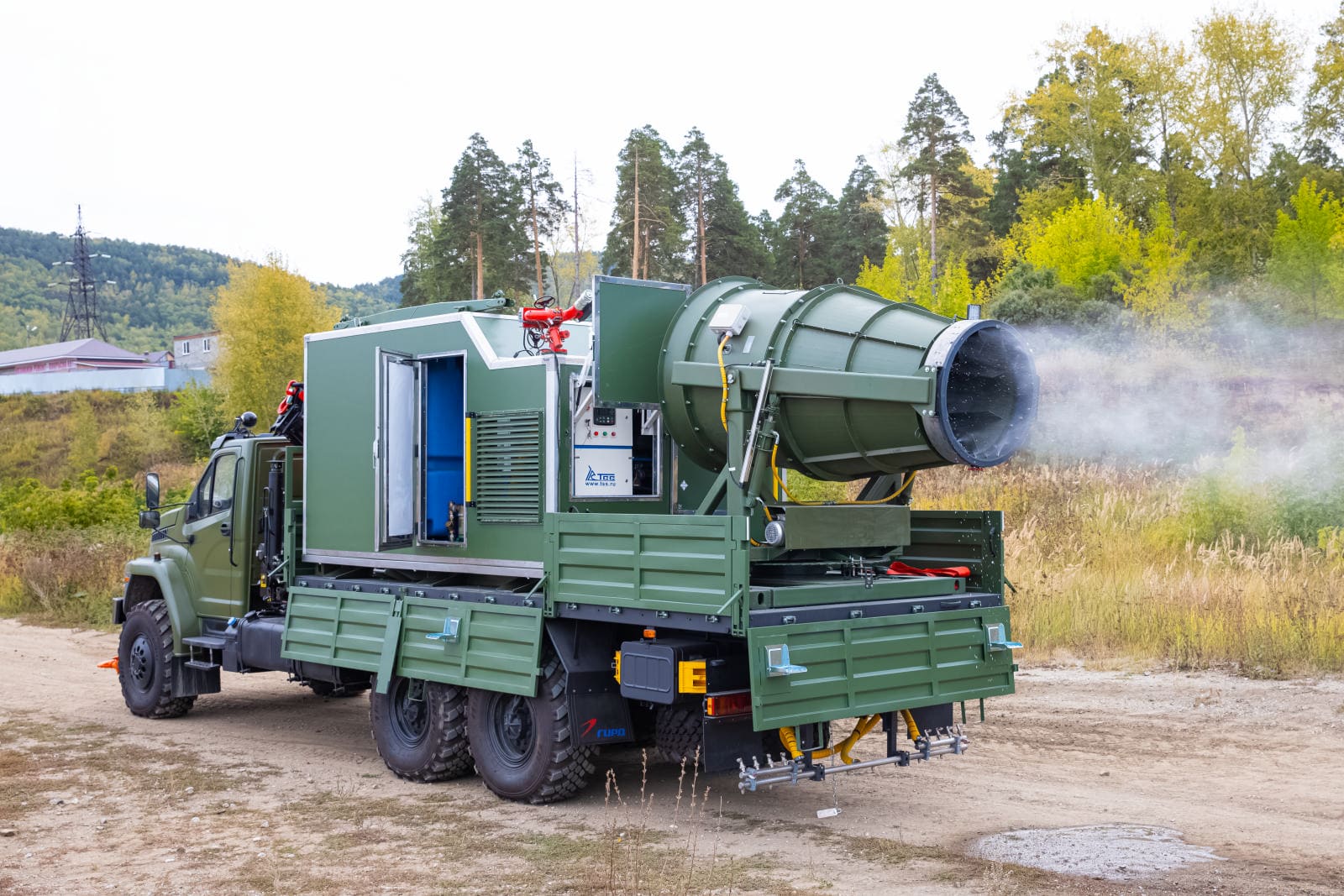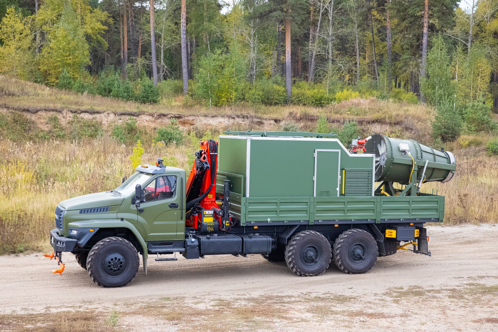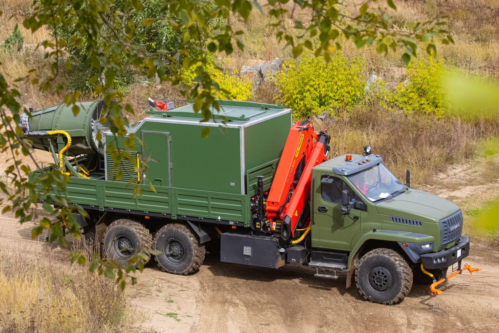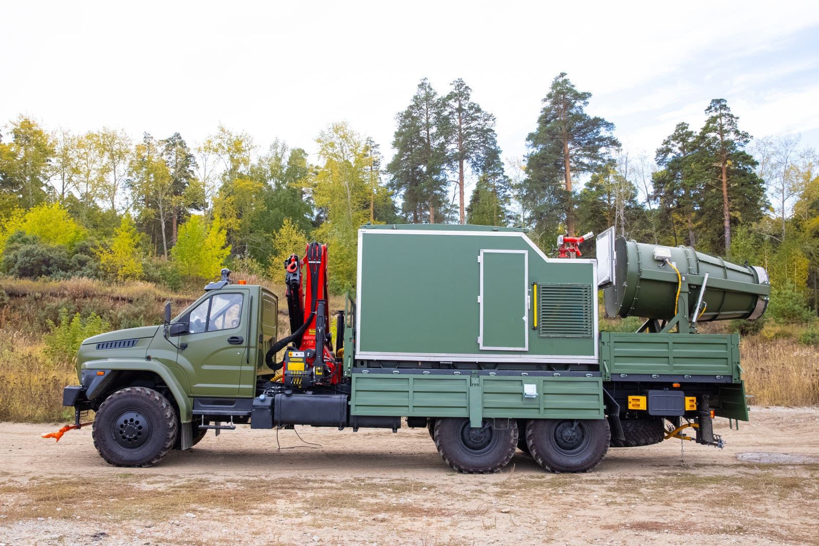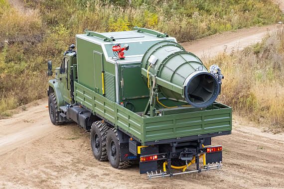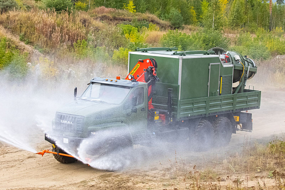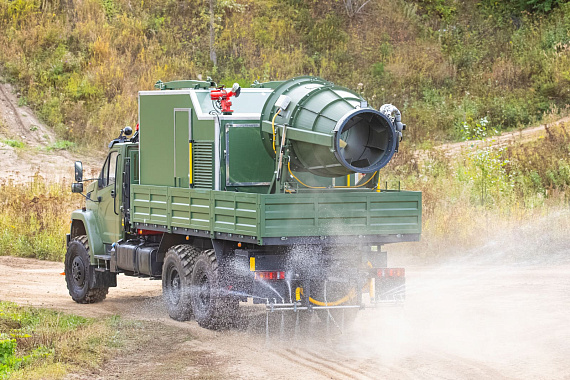 В Монголию отправился специальный автомобиль со съемным модулем с кму Palfinger PK 21.501SLD1 на шасси Урал 4320, который является собственной разработкой завода ГИРД. Такой автомобиль идеален для пылеподавления на карьерах, стройках, угольно-добывающих площадках, дезинфекции уличных территорий, зданий, техники, дезинсекции и полива зеленых насаждений. Данная спецтехника носит универсальный характер – полностью автономная работа съемного модуля для пылеподавления и санитарной обработки, возможность адаптации под любые условия работы: