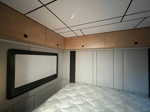 - Зона сна отделена перегородкой, свешена ортопедическим матрасом, освещение потолка имитирует звездное небо.