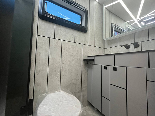 - Санузел оснащен унитазом , раковиной, душевой кабиной, водонагревателем и баком для чистой воды.