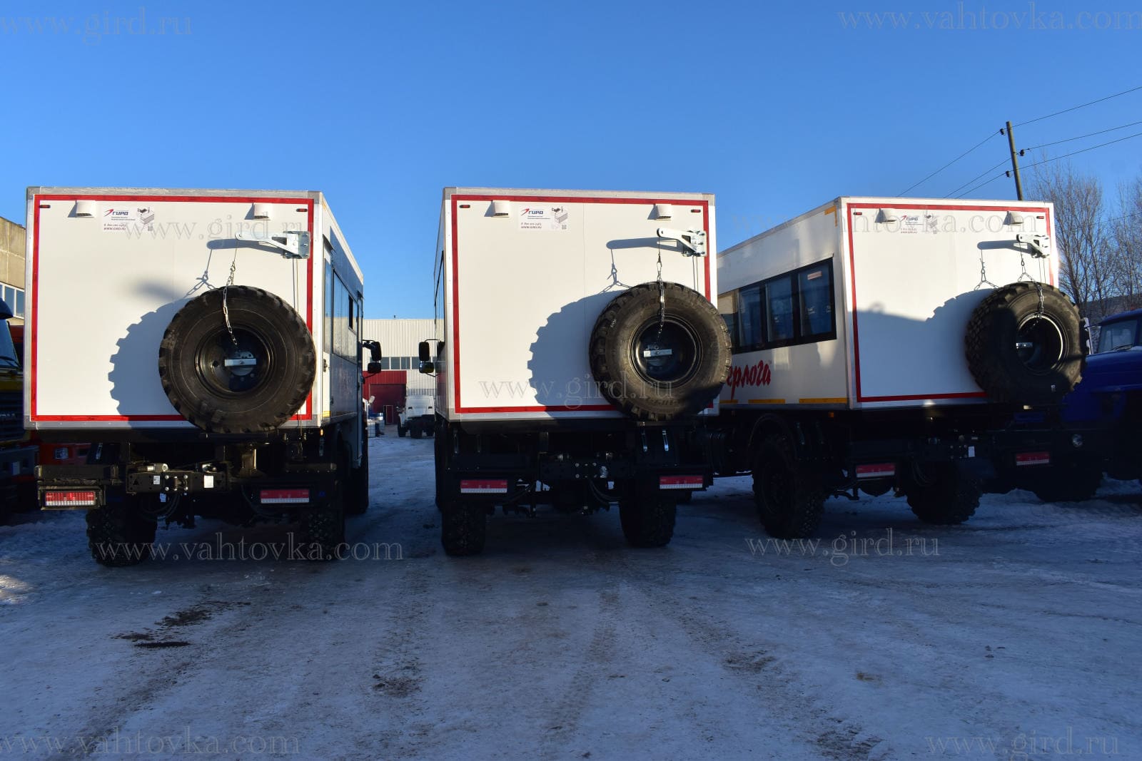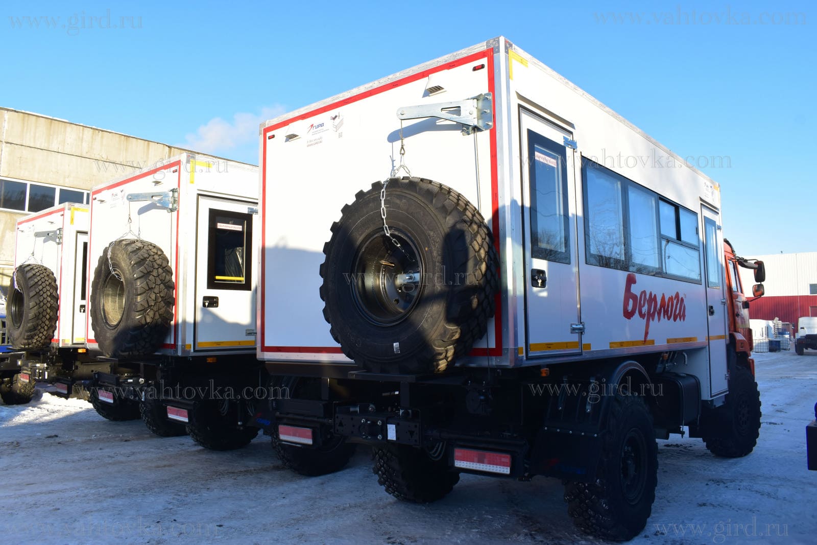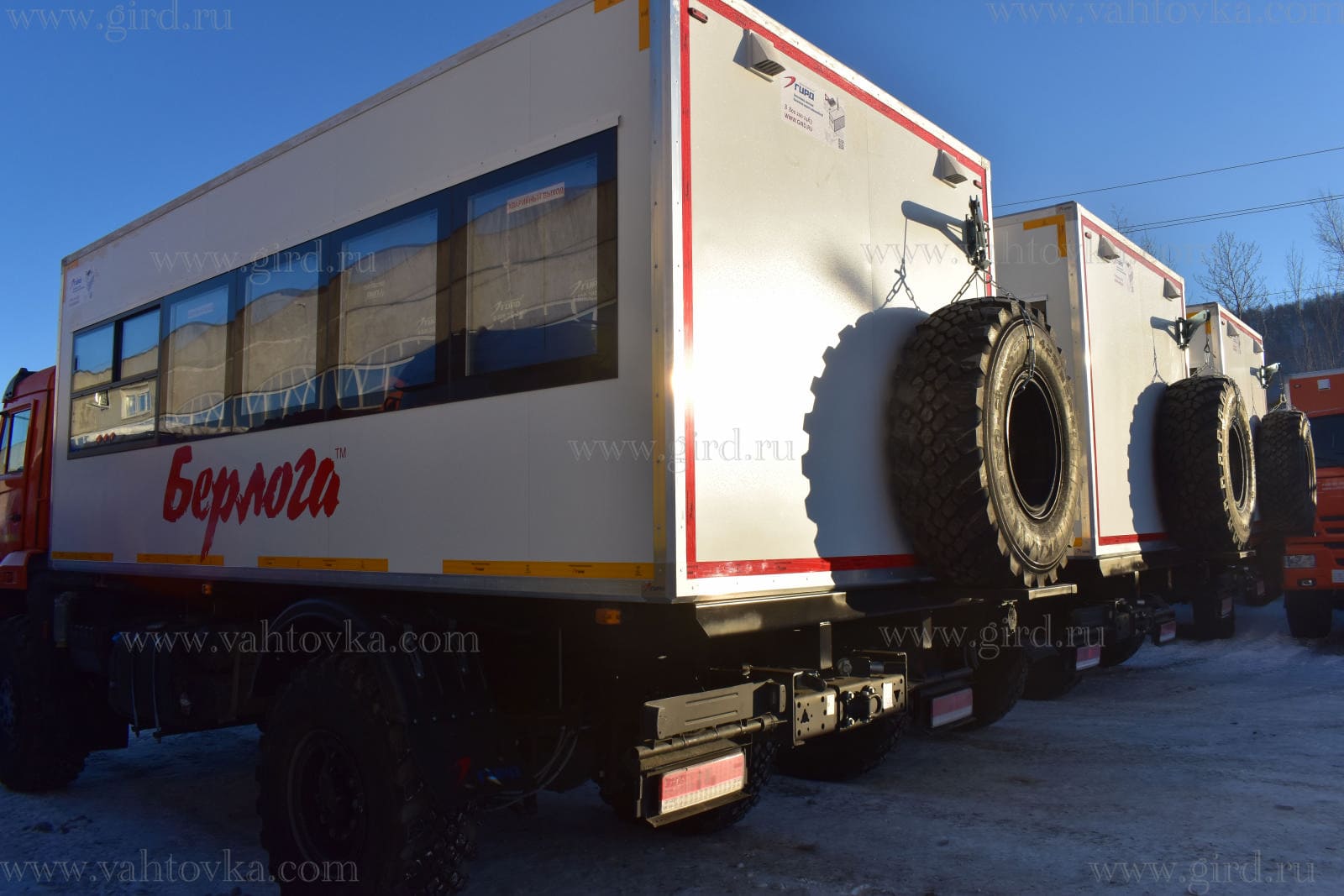 Вахтовый автобус БЕРЛОГА (3 шт) на шасси Камаз 43502. Фургон изготовлен из 5слойных сэндвич-панелей собственного производства по бескаркасной технологии фургоностроения и рассчитан на 22 пассажирских места.