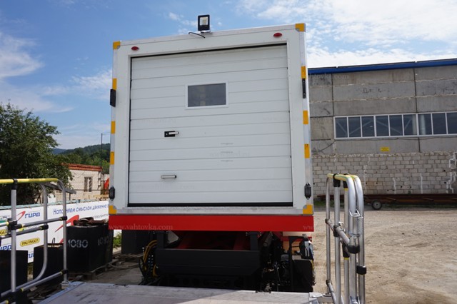 Изготовлен из термоизолирующих панелей типа «сендвич». Обеспечивает защиту от попадания атмосферных осадков внутрь. Пол кузова имеет полимерное противоскользящее покрытие. Боковые части кузова имеют окна |
