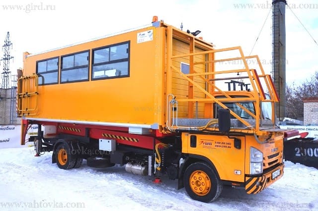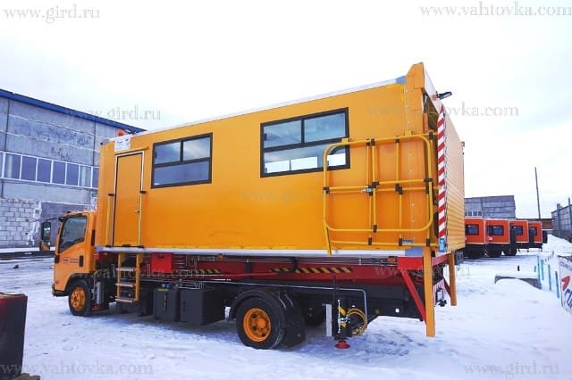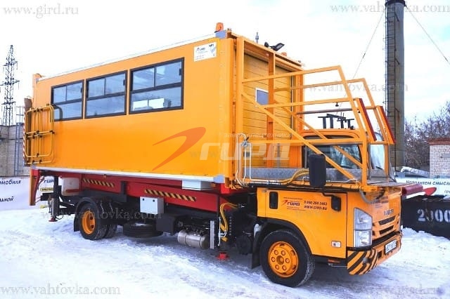 Кузов изотермический, изготовлен из сэндвич-панелей, внутренняя отделка - пластик белого цвета. Пол кузова - противоскользящее металлическое покрытие. Боковые части кузова справа и слева оборудованы окнами (2-а окна со стороны водителя и 3-и окна со стороны пассажира). Внутреннее освещение кузова осуществляется с использованием 6-ти светодиодных светильников. С левой стороны кузова по ходу движения установлена распашная дверца для доступа внутрь кузова с поверхности земли. В основании дверцы установлена лестница с поручнями. |