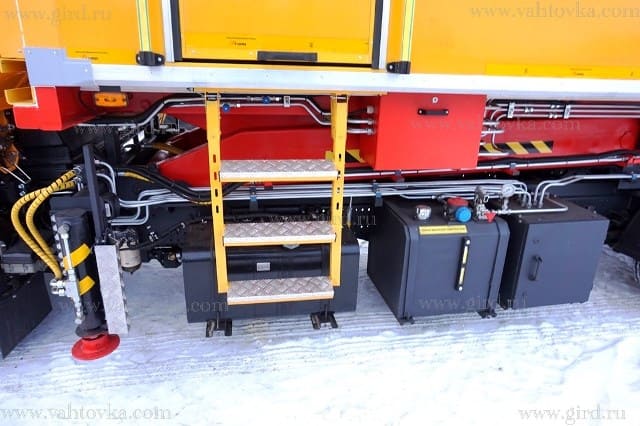 Отсек гидравлической системы установлен на шасси. Гидравлический бак, объемом 100 литров, установлен на шасси и оснащен обратным фильтром и индикатором уровня. В отсеке установлена гидросхема. Для упрощения технического обслуживания и повышения безопасности отсек находится снаружи кузова. Механизм отбора мощности установлен непосредственно на коробке передач базового шасси. |