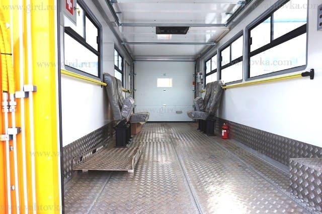 Кузов оборудован креплениями (направляющими) для фиксации носилок (1 шт.) и инвалидных кресел (2 шт.), а также 4 (четырьмя) откидывающимися креслами для обслуживающего персонала или пассажиров. |
