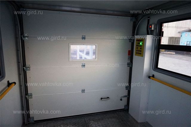 Две роллетные двери спереди и сзади кузова (складываются вверх), передняя дверь - с окном, выходящим на переднюю площадку |