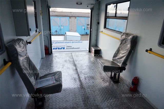 Внутри по обоим бортам кузова поручни, крепления для инвалидных кресел, откидные сиденья для обслуживающего персонала |