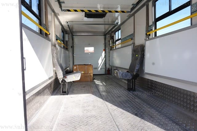Две роллетные двери спереди и сзади кузова (складываемые вверх), передняя дверь - с окном, выходящим на переднюю площадку. |