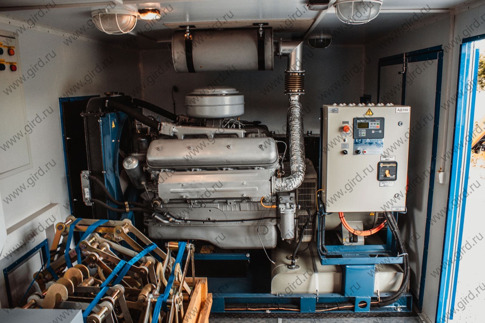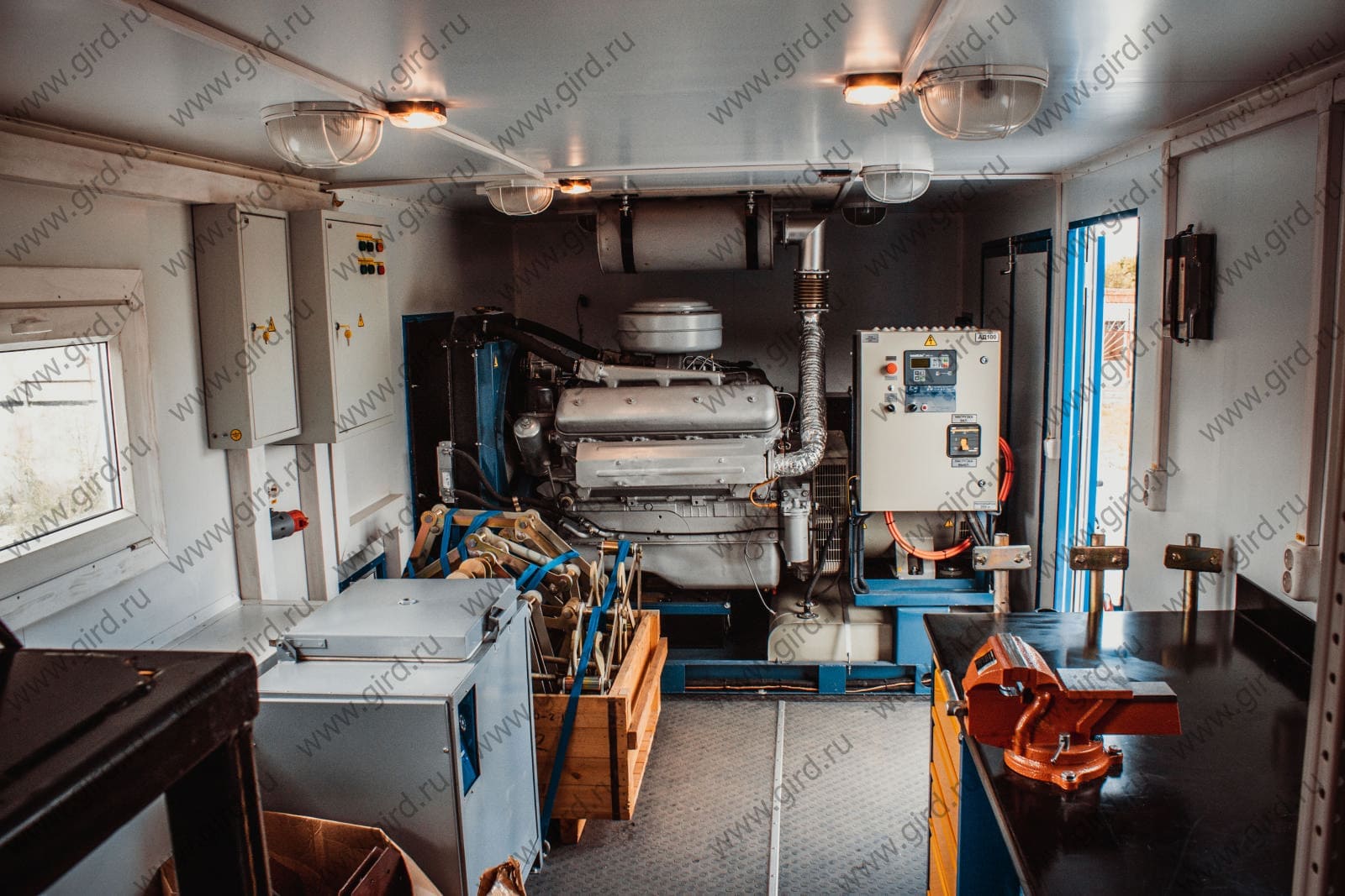 Кузов фургон 6750×2460×2190 мм., прямоугольной формы, каркасного типа (цельнометаллический, сварной, усиленный, обшитый снаружи коррозионно стойким стальным листом, утепленный (теплоизоляция Стиропен 60 мм «Север»), снабжен окнами (стеклопакеты) с двойным остеклением., Пол комбинированный деревянный (шпунтованная доска 40 мм, фанера, снаружи покрыт металлическим листом, внутри покрыт Автолином серого цвета, в месте установки АД-100 — рифленый металл:, -наружная отделка — высокотехнологичный коррозионностойкий плакированный металл синего цвета, -фанера 4 мм, -утеплитель экологически чистый «Стиропен» 60 мм, -фанера 4 мм, -внутренняя отделка — плакированный металл белого цвета., Панель пола толщиной 80 мм:, -нижний слой плакированный металл, -фанера 12 мм, -утеплитель армированный экологически чистый «Стиропен» с поперечными брусками толщиной 40 мм., -фанера 24 мм, -Автолин серого цвета, в месте установки АД-100 — рифленый металл.