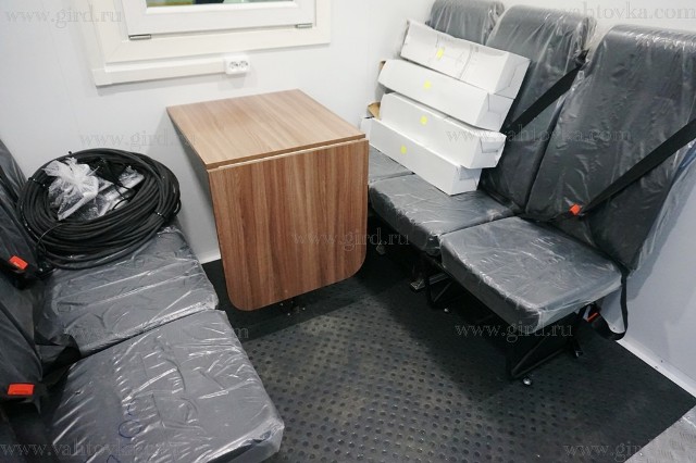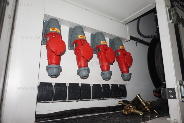 Кузов-фургон (6750*2500x2190) из сэндвич панелей прямоугольный толщина 60 мм., наружная обшивка-плакированный металл, утеплитель- стиропен 50, пол-80 мм., покрытие пола – автолин, алюминиевое обрамление фургона. Кузов разделен на 3 отсека: -пассажирский отсек (6 мест) -отсек для электростанции - технологический отсек |