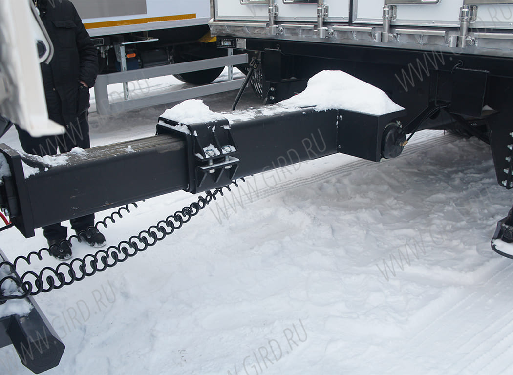 Основное шасси | Прицеп - тандем «ГИРД 8753D» Максимальная полная масса прицепа, кг. 18000 Максимальная нагрузка на сцепное устройство тягача, кгс 1000 Максимальная нагрузка на дорогу через шины, кгс 17000 Максимальная скорость, км/ч 90 Оборудование прицепа: - пневматическая подвеска ф. SAF (Германия) - шины 385/65R22,5 (4+1 шт.) - телескопическое дышло с гидравлическим приводом от тягача - управление стопорами дышла пневматическое - сцепная петля дышла диаметром 40 мм - телескопические стойки (4 шт.) - тормозная система с АБС - стояночная тормозная система с энергоаккумуляторами - боковая защита - держатель запасного колеса с редуктором - задние фонари и фонари освещения номерного знака - кронштейн задних фонарей |