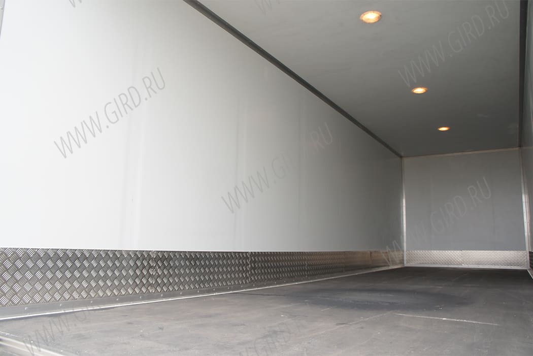 - задние распашные двери, с фиксацией на фургоне в открытом положении - на дверях накладные штанговые запоры поворотного типа из нержавеющей стали с ручкой Push (FURGOCAR , Италия); каждая створка крепится на 4-х петлях из нержавеющей стали (FURGOCAR , Италия) - задний противооткатный брус, резиновые отбойники - утопленные плафоны внутреннего освещения кузова (вкл./выкл., при открывании дверей, от концевого выключателя станочного типа) - пластиковые крылья с брызговиками - безопасный доступ в фургон - боковая защита - отбойная полоса из рифленого алюминия по внутреннему периметру фургона высотой 300мм |