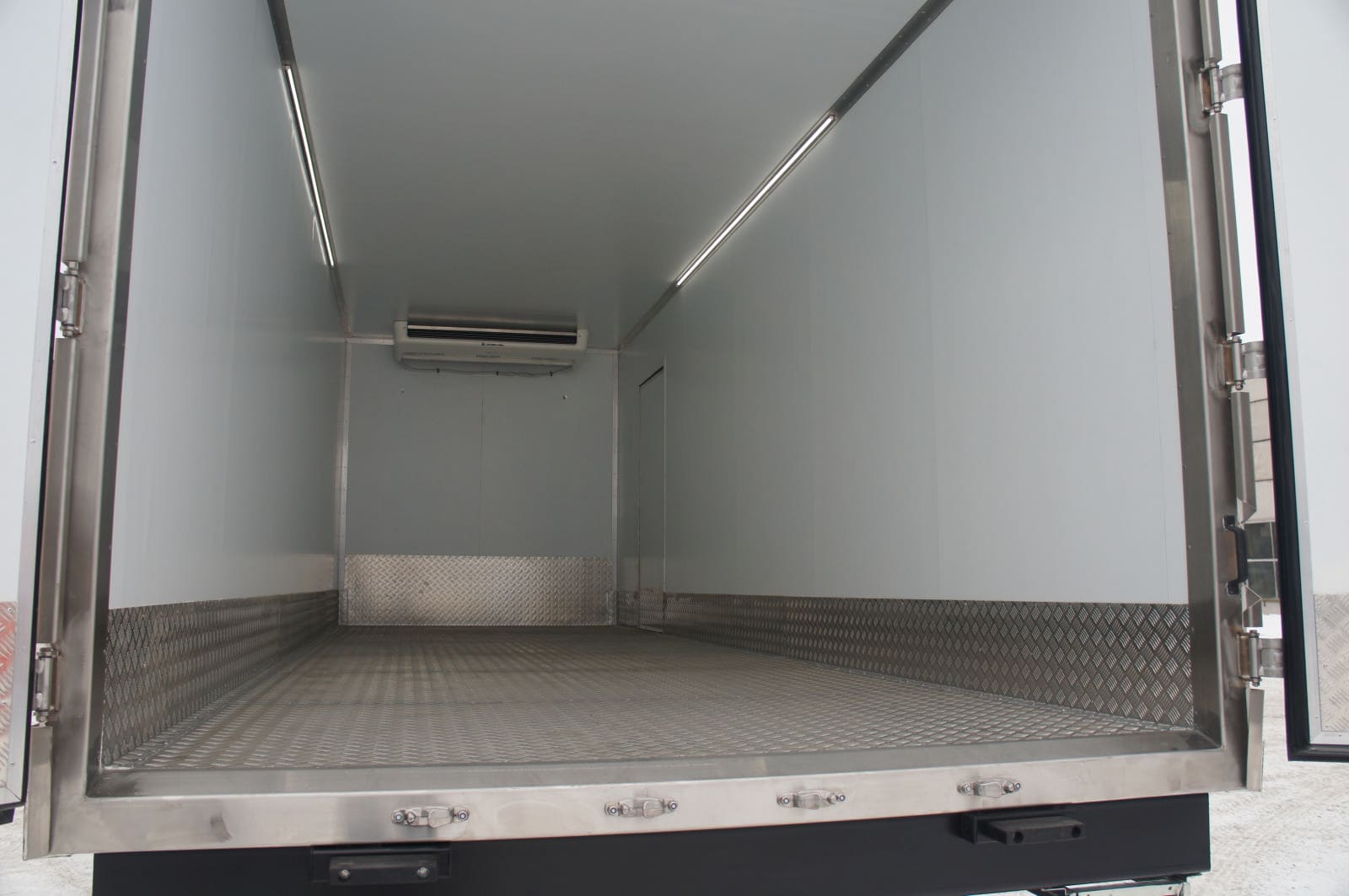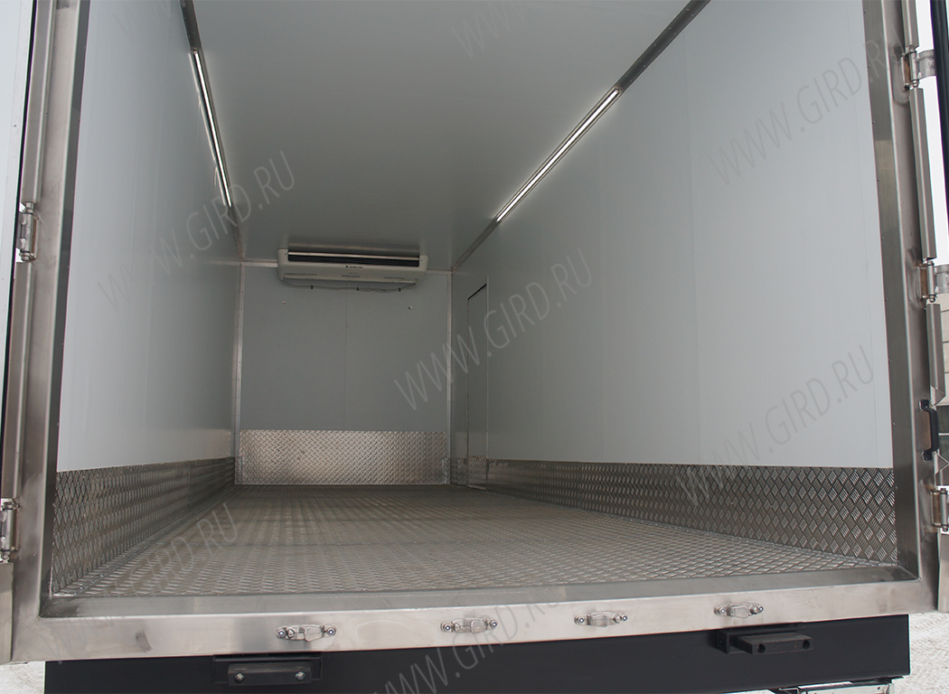 - задние распашные двери, с фиксацией на фургоне в открытом положении. На дверях по два накладных штанговых запора поворотного типа из нержавеющей стали с ручкой Push (FURGOCAR , Италия); каждая створка крепится на 4-х петлях из нержавеющей стали (FURGOCAR , Италия) - боковая распашная дверь шириной 900 мм. и высотой 2000 мм., с фиксацией на фургоне в открытом положении. На двери один утопленный штанговый запор поворотного типа из нержавеющей стали с ручкой Push (FURGOCAR , Италия); створка крепится на 2-х петлях из нержавеющей стали (FURGOCAR , Италия) - светодиодная лента внутреннего освещения кузова (вкл./выкл. с кабины автомобиля) - отбойная полоса - рифленый алюминиевый лист нижней части внутренних боковых стенок, дверей высотой 300 мм и на передней стенки 600 мм с проваркой швов («ванна»). - установка фургона на шасси |