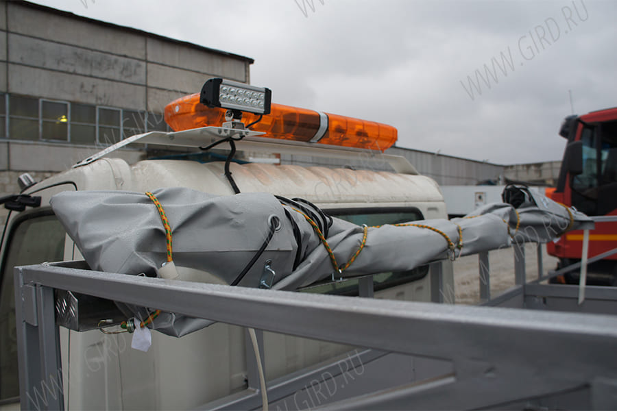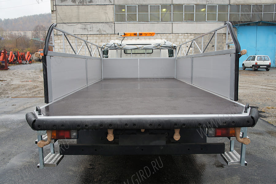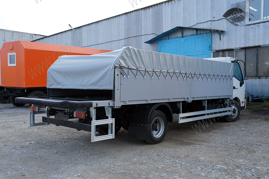 Бортовая платформа с тентом, задней аппарелью, ограждением и резиновой защитой, лестница трап с двух сторон. Парковочная система с монитором в кабине водителя и камерой заднего вида.