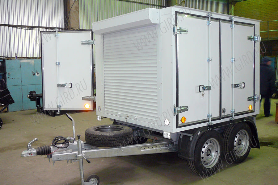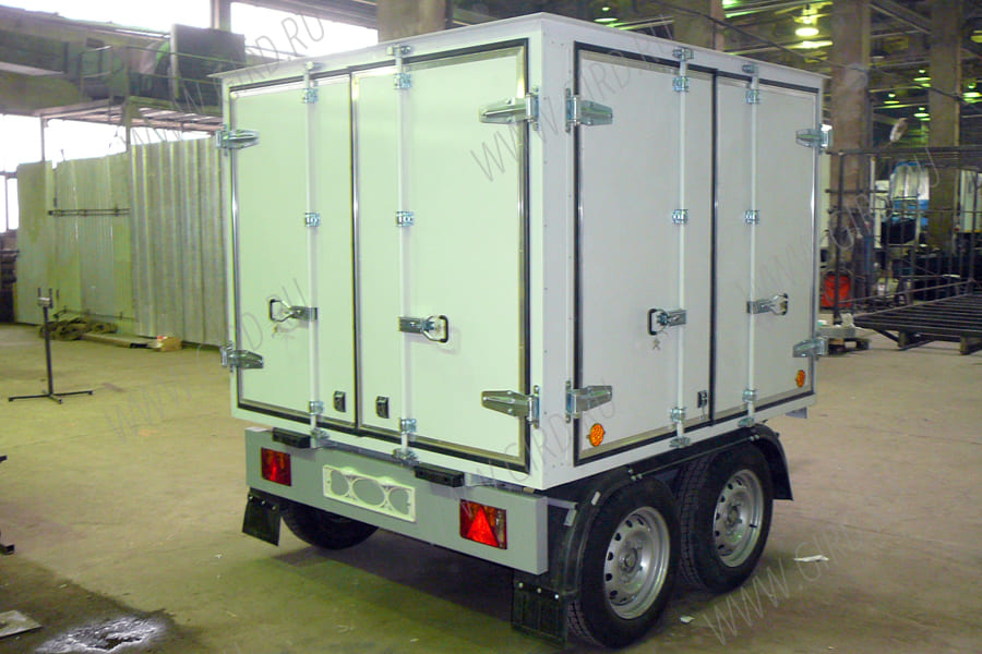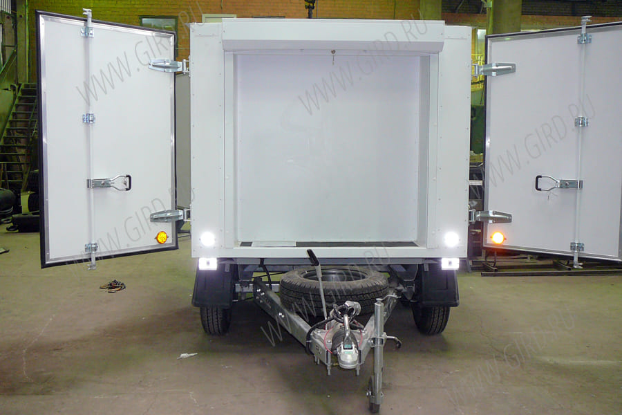 Прицеп на основе комплектующих производства AUTOFLEX-KNOTT: - тележка-тандем с тормозом VGDB30-35 или аналог - дышло ZHL-35 длиной 1200 мм от передней стенки фургона - сцепная головка с тормозом наката KFR-35 |