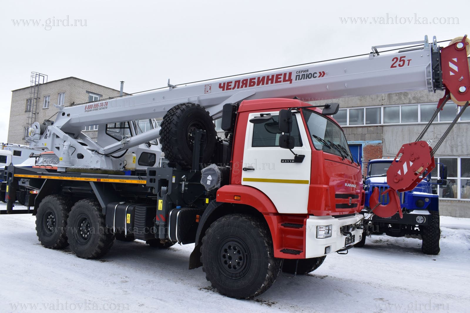 Кран автомобильный КС-55732 на шасси Камаз 43118. Базовое исполнение: трехсекционная стрела овоидного профиля; крюковая обойма г/п 25т.; грузовая лебедка с планетарным редуктором и дисковым тормозом; современная комфортабельная кабина оператора, утепленная изолирующим материалом; эргономичное кресло оператора; органы управления – рычаги, отопитель кабины оператора, предпусковой подогреватель двигателя базового шасси, температура эксплуатации ±40˚С.