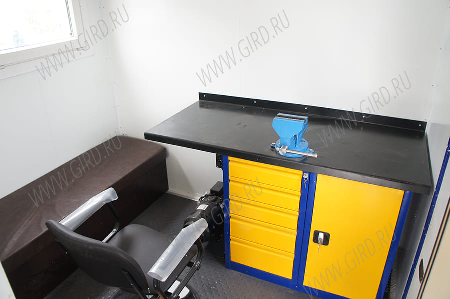 В стандартной комплектации АИС в операторском отсеке размещены: пульт управления лебедкой, сиденье оператора, верстак с тисами, шкаф для одежды и рундук.