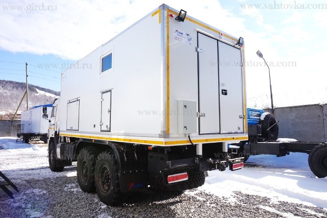 Шасси КАМАЗ 43118 Доработка шасси: - Доработка электросистемы шасси (отбор электроэнергии 24В); - Установка ответных кронштейнов крепления кузова-фургона; - Установка элементов подключения генератора EG202.7; - Удлинение рамы; - Кнопка "аварийная остановка" – 2 шт; - Сигнализация звуковая заднего хода автомобиля; - Проблесковый маячок оранжевого цвета; |