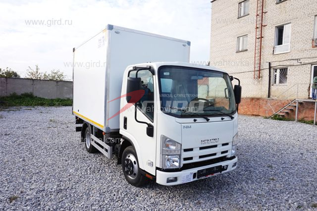 Изотермический фургон на шасси ISUZU NMR85H (3,5 т), выполненными по бескаркасной технологии (монолитная сендвич-панель) с применением следующих материалов и конструктивных особенностей: Сендвич-панель производства ГП "ГИРД" — монолитный конструкционный материал, имеющий многослойную структуру, состоящую из листов жёсткого материала (металл, стеклопластик, фанера и т.д.) и слоя утеплителя между ними. Все детали сэндвич-панелей склеиваются между собой с помощью вакуумного прессования. |