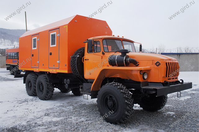 Кузов-фургон со скосами, оранжевого цвета. Габаритные размеры автомобиля, мм 9500x2500x3700 Комплектация пассажирского отсека: 1. До 6-ти посадочных мест (автомобильные кресла,) 2. Диван-рундук 3. Переговорное устройство с кабиной водителя 4. Освещение лампами дневного света 5. Люк(приточно-вытяжная вентиляция) 6. Окно с форточкой 7. Шкаф для личных принадлежностей и одежды 8. Вентилятор 9. Кнопка зуммер для подачи сигнала водителю