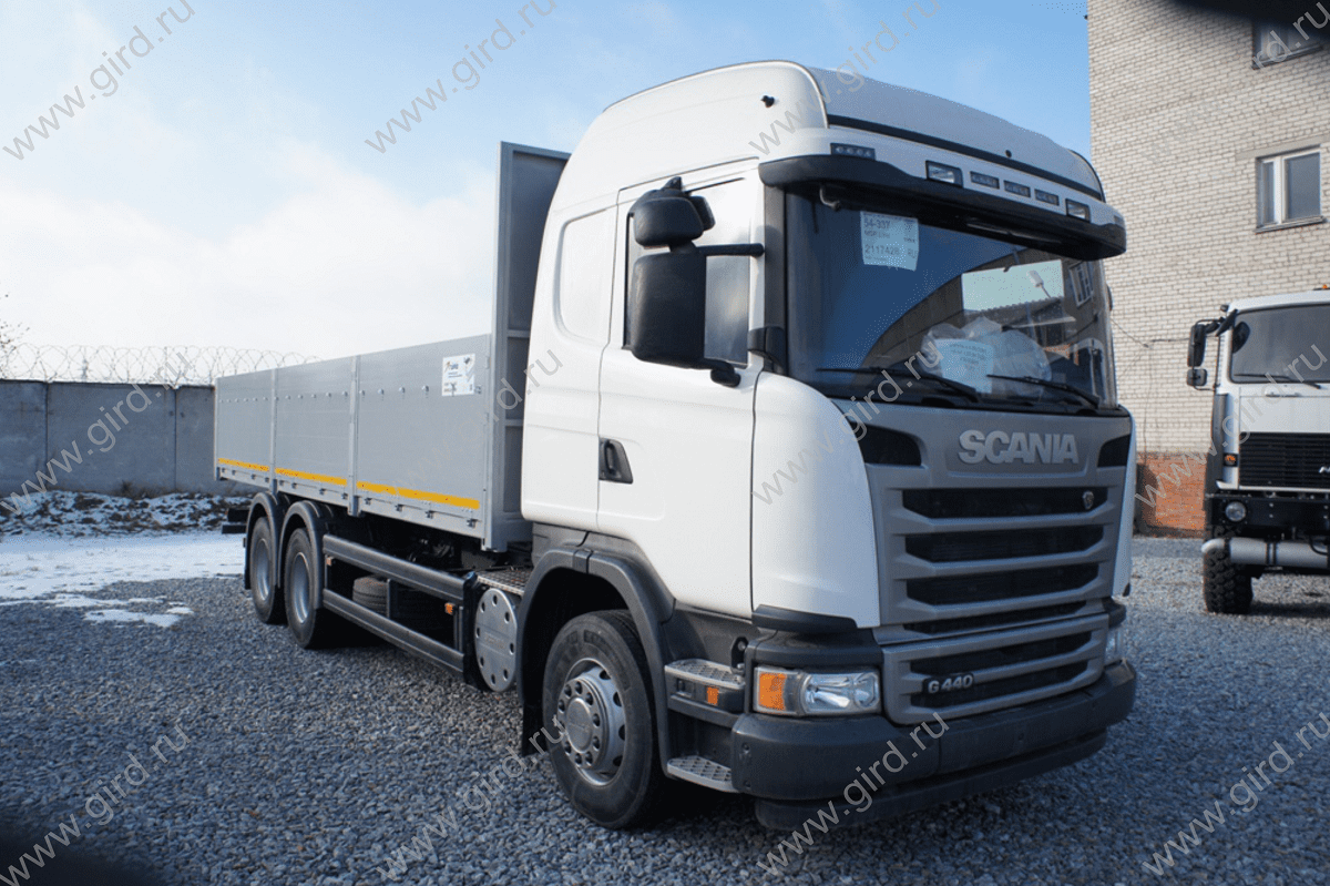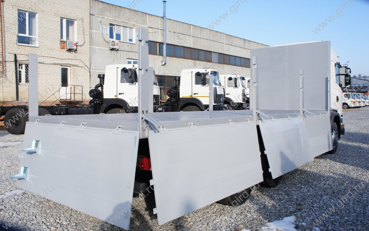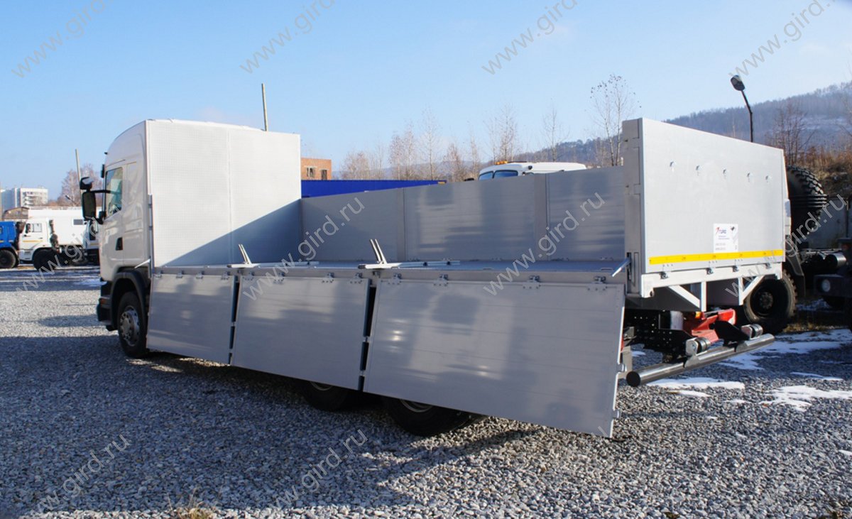 Бортовой автомобиль на шасси Scania G440LB, 6x2 HSA. Наружные размеры бортовой платформы 7400 х 2550 х 1000 мм. При изготовлении предусмотрены решения: - передний борт - каркас из труб 50х50 мм. высотой 2 000 мм., с внутренней стороны обшитый рифленым стальным листом 3 мм.; - бортовая платформа подвергается дробеструйной обработке, грунтованию, покраске - задний и боковые борта из алюминиевых профилей, откидные; - усиленные, съемные стойки бортов из стали - 4 шт.; - с наружной стороны каждого борта по 3 петли для крепления полога (тента); - роликовые резиновые отбойники для предотвращения ударов при парковочных маневрах на задней части бортовой платформы; - пол – усиленный из рифленой стали 4 мм.; - безопасный доступ на платформу – складные лестницы на заднем борту; - петли для крепления груза в полу. |