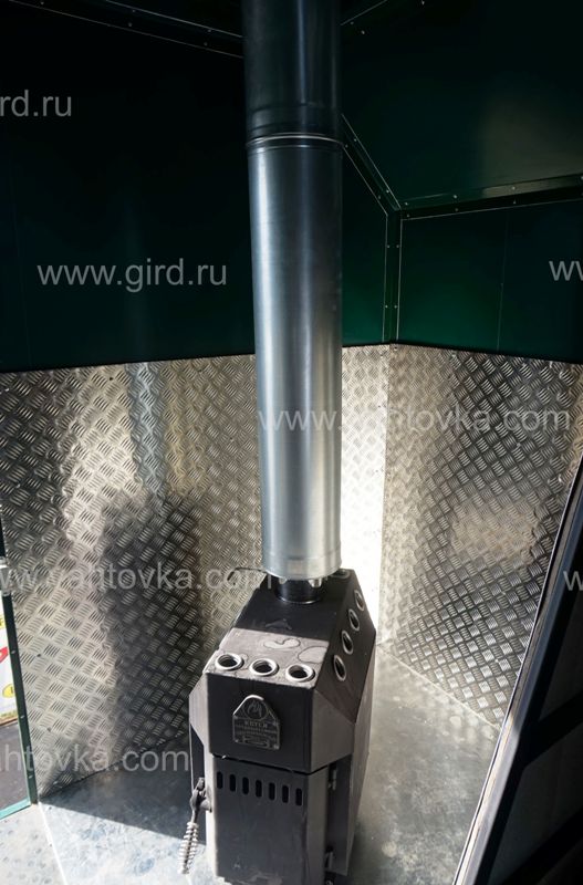 Печь дровяная "Теплодар Т-100" с облицовкой панелей в месте размещения печи рифленым алюминием (или асбестом), с установкой перегородки из негорючего материала |