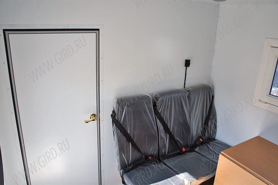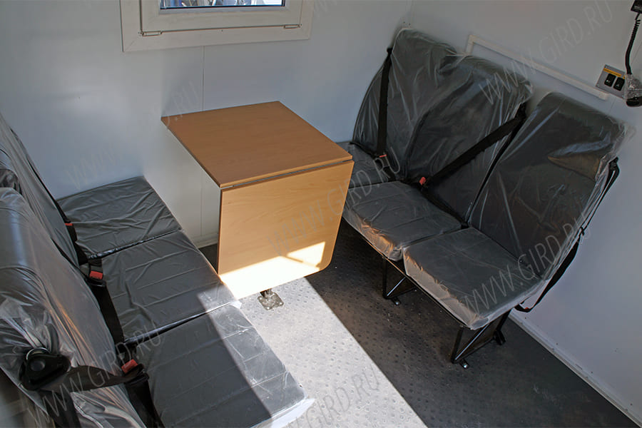 Фургон разделен на 2 отсека, в переднем отсеке 6 пассажирских сидений стоящих друг против друга между ними откидной стол, в этой части фургона два окна, одно с форточкой другое в двери, вентиляционный люк. Второй отсек фургона отделена глухой стенкой с дверью в первую часть фургона, в задней части 2 двери на всю ширину. Отопительная установка Планар 4 кВт в пассажирском отсеке, тосольная печка, переговорное устройство. Внутренняя и наружная обшивка фургона плакированный металл, цвет белый