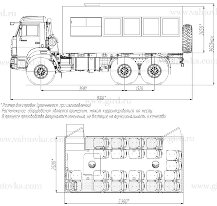 Вахтовый автобус БЕРЛОГА на шасси Камаз 43502. Фургон изготовлен из 5слойных сэендвич-панелей собственного производства по бескаркасной технологии фургоностроения и рассчитан на 22 пассажирских места.