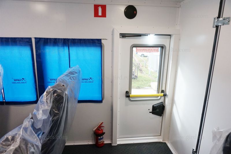 Дверь боковая одностворчатая эвакуационная, глухое окно с двойным стеклопакетом («триплекс») с конечным выключателем открывания двери и подсветки входа, с устройствами фиксации в открытом положении, с усиленным замком,с возможностью открывания изнутри |
